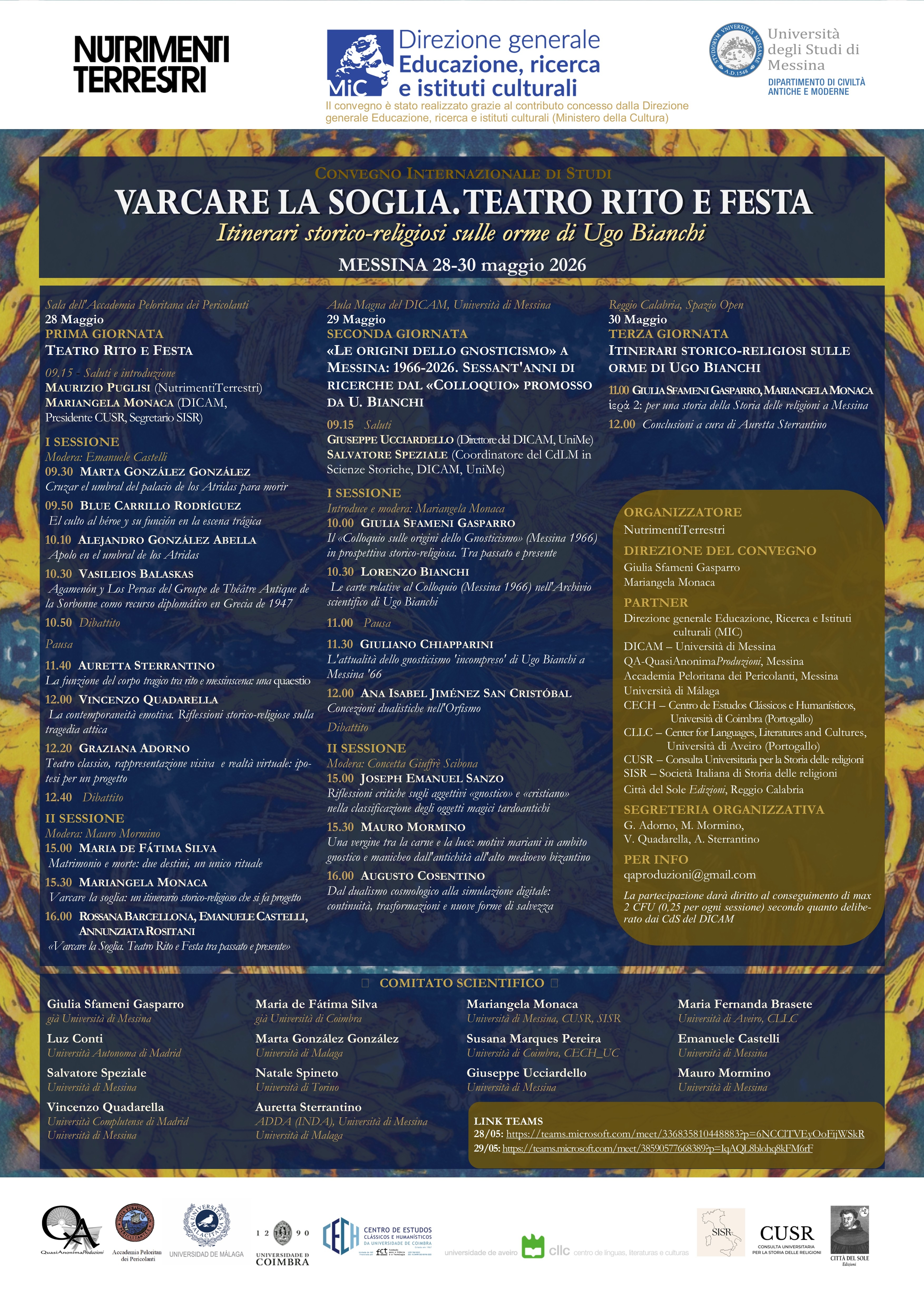 - Varcare la soglia: teatro rito e festa. Itinerari storico-religiosi sulle orme di Ugo Bianchi, Messina, 28-30 maggio 2026.