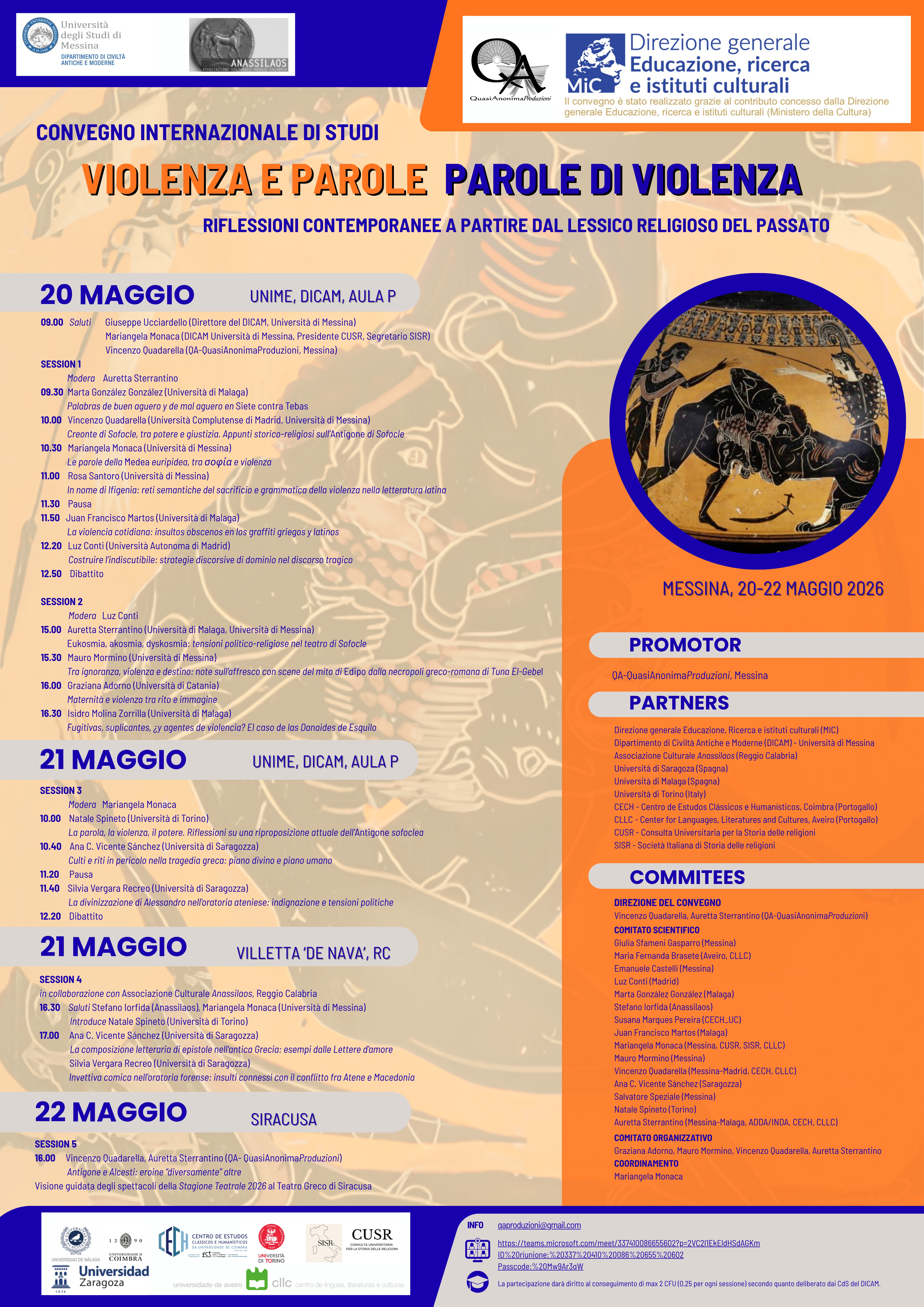 - Violenza e parole, parole di violenza. Riflessioni contemporanee a partire dal lessico religioso del passato, Messina, 20-22 maggio 2026.